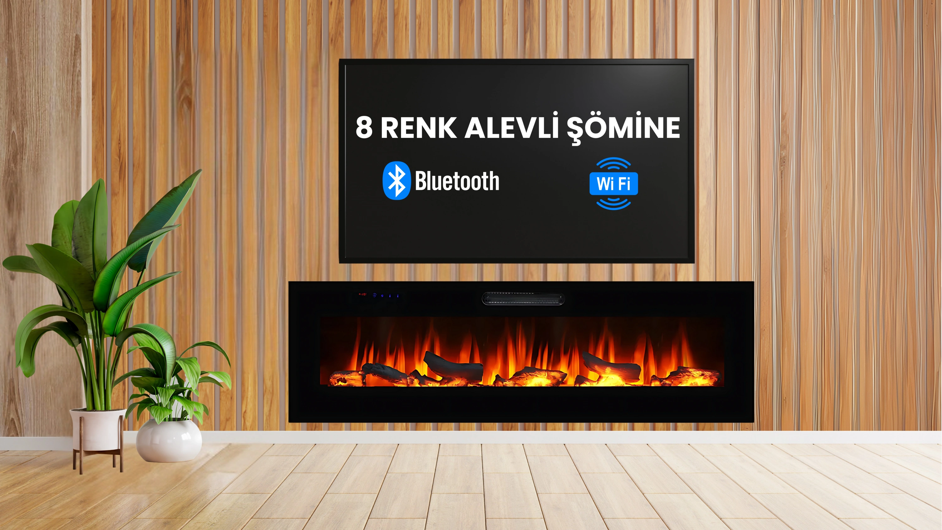 Dekoratif Elektrikli Şömine 8 Renkli Bluetoothlu, Alev Sesli Wifili